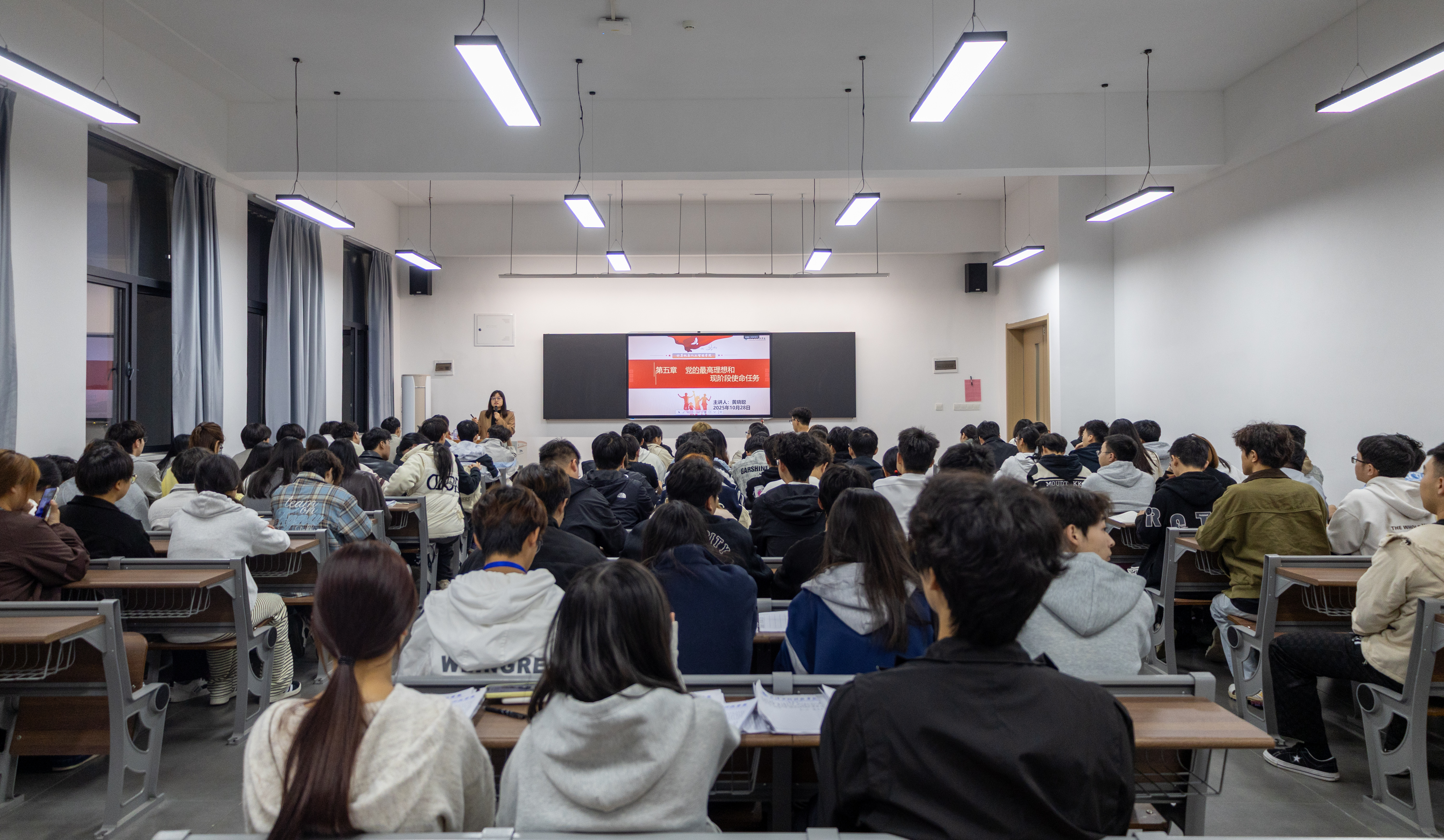 首先,黄晓聪老师解读了党的最高理想和最终目标是实现共产主义。她说为了实现共产主义这一最高理想和最终目标,党始终坚守初心使命、引领民族前行;为了锚定这一根本方向,现阶段党团结带领全国各族人民,聚焦以中国式现代化全面推进强国建设、实现民族复兴的中心任务,在新时代新征程上攻坚克难、勇毅奋进,一步步朝着共产主义的宏伟蓝图扎实迈进。在明确党的长远奋斗目标后,黄老师进一步结合中国特色社会主义发展实际,系统阐释了当前阶段的行动纲领。