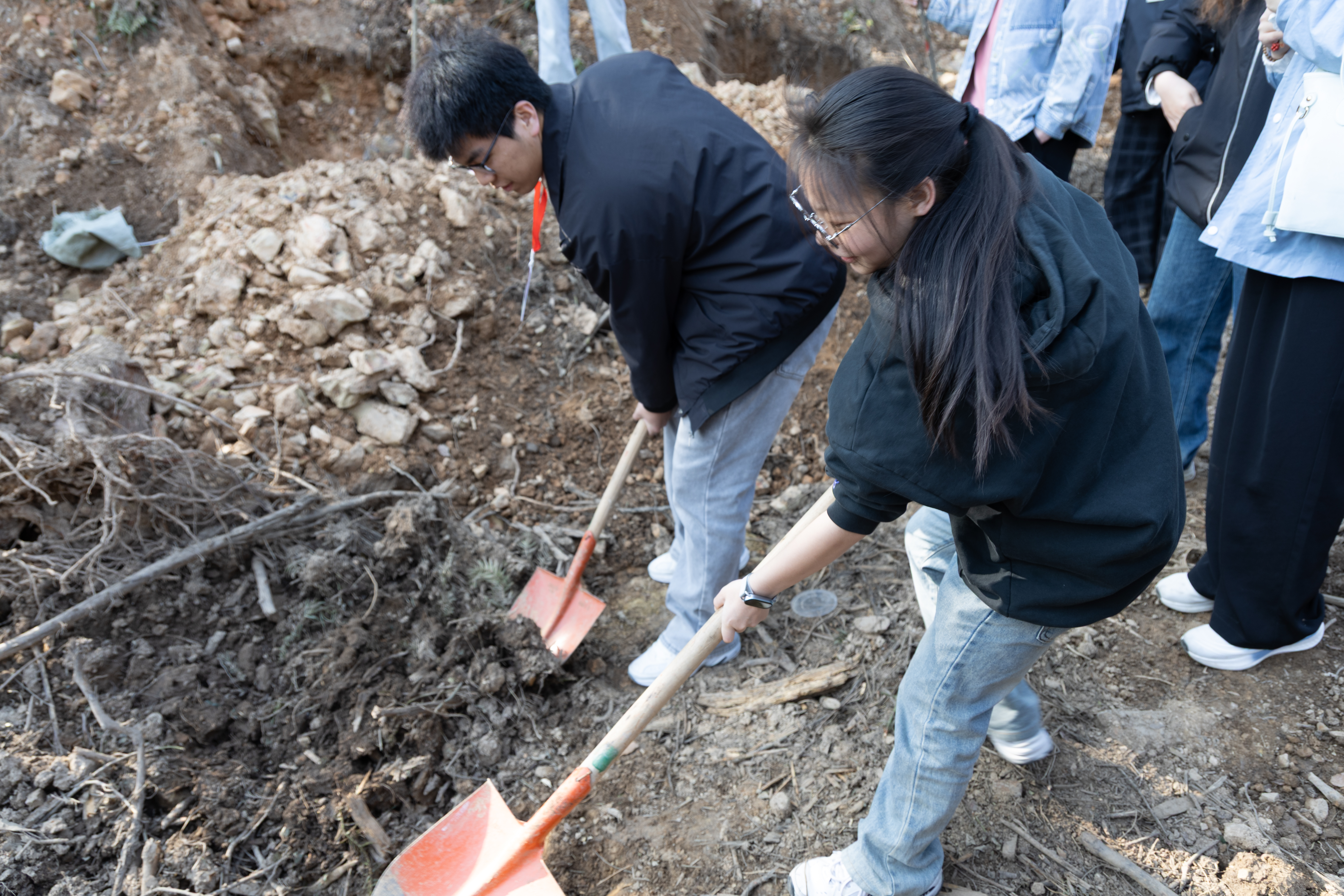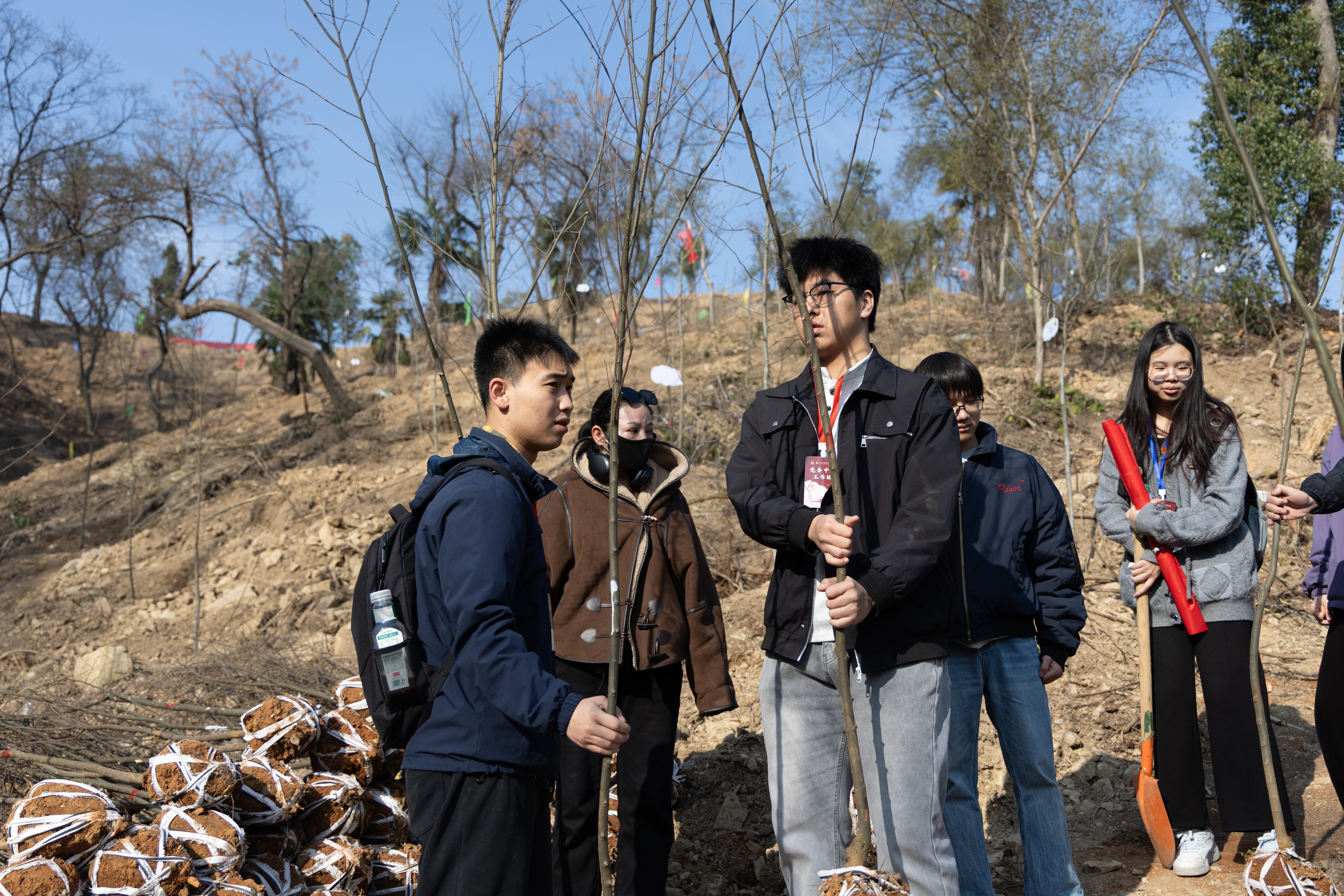 上午9时,志愿者们抵达植树现场。在社区工作人员的技术指导下,大家迅速投入劳动。党务工作者带头干在前,青马班学员紧随其后,大家分工协作、相互配合,现场秩序井然。时近正午,阳光强烈,但志愿者们没有停歇,互相鼓励着坚持完成最后的栽种。经过三个小时的连续奋战,几十余株新栽树苗迎风挺立,大家以实际行动践行生态文明理念,在春日为青龙山环山绿道增添了一片新绿,也种下了守护生态的责任与初心。